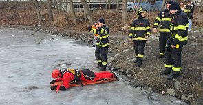 Hasiči cvičili záchranu člověka na zamrzlém rybníku