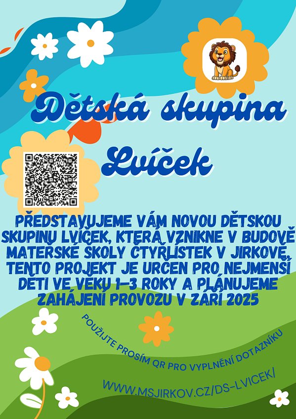Nová dětská skupina Lvíček vznikne v budově mateřské školy Čtyřlístek v Jirkově. Tento projekt je určen pro nejmenší děti ve věku 1-3 roky. Plánované zahájení provozu je v září 2025.