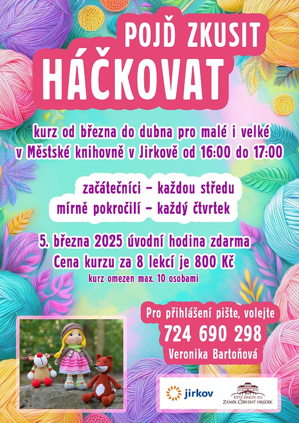 5. a 6. 3. 2025 od 16 hodin POJĎ ZKUSIT HÁČKOVAT kurz pro začátečníky (středa) a kurz pro pokročilé (čtvrtek) Městská knihovna Jirkov 8. 3. 2025 od 9 ...