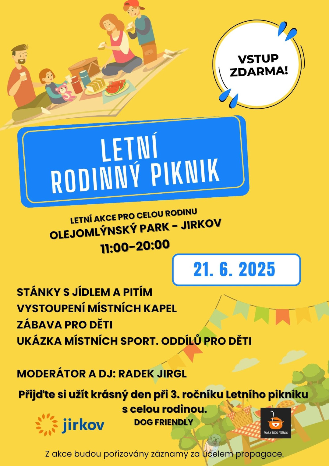 Pořádáme pro Vás Letní rodinný piknik. Doražte se svou rodinou nebo přáteli na něco dobrého do žaludku, poslechnout si hudbu a odpočinout si do Olejomlýského parku od 11:00 do 20:00 hodin. Pro děti tu bude možnost vyzkoušet si disciplíny sportovních klubů z Jirkova, které si pro děti připravily soutěže, také se zde budou moct zatočit na kolotočích, případně budou moct využít dětských prolejzaček, které park nabízí.